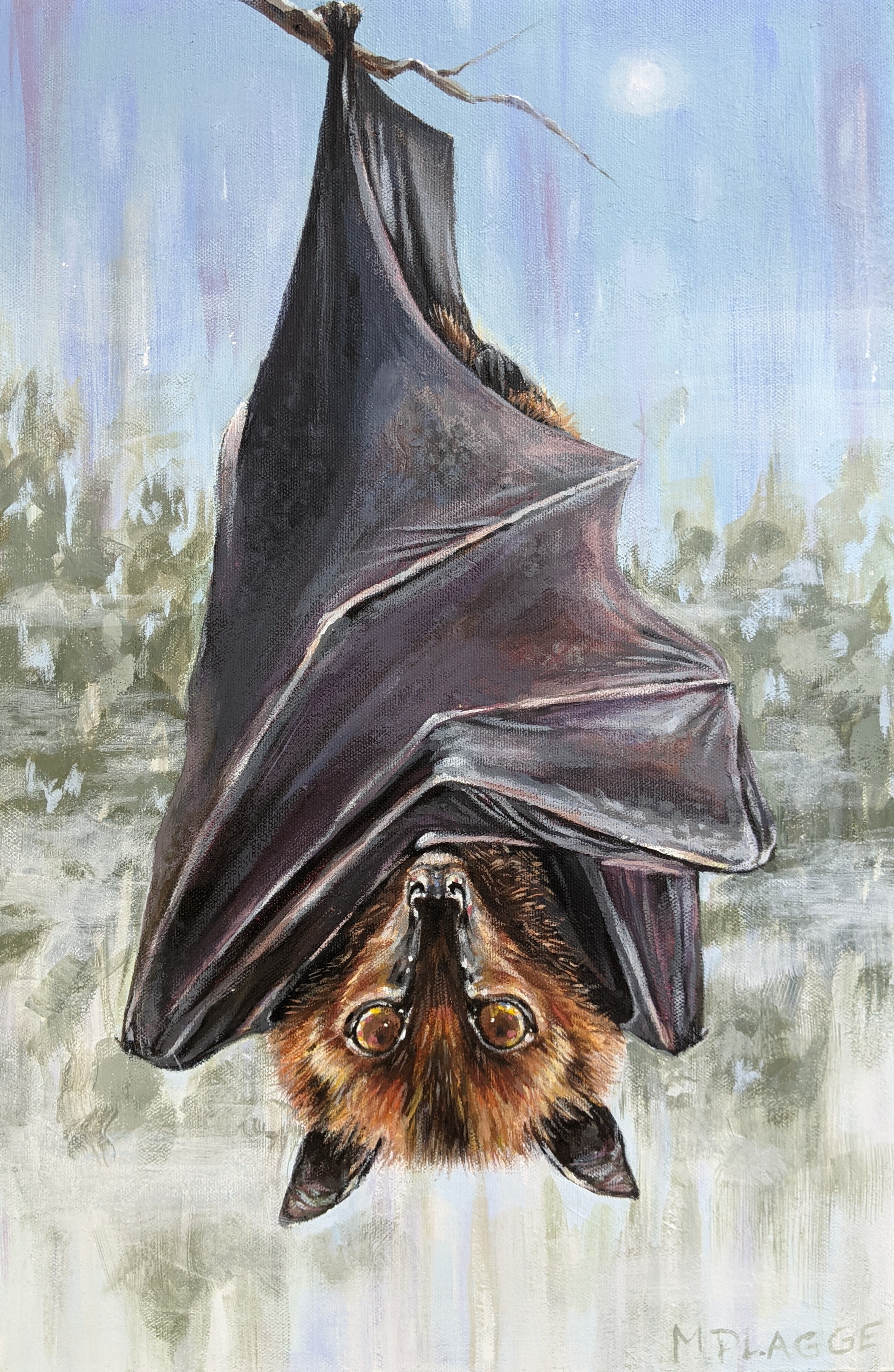 This original acrylic painting celebrates our misunderstood bat friends. Important to a healthy ecosystem, bats are super neat creatures, and in the artist’s opinion actually pretty cute. This is a painting of a fruit bat, also known as a megabat.