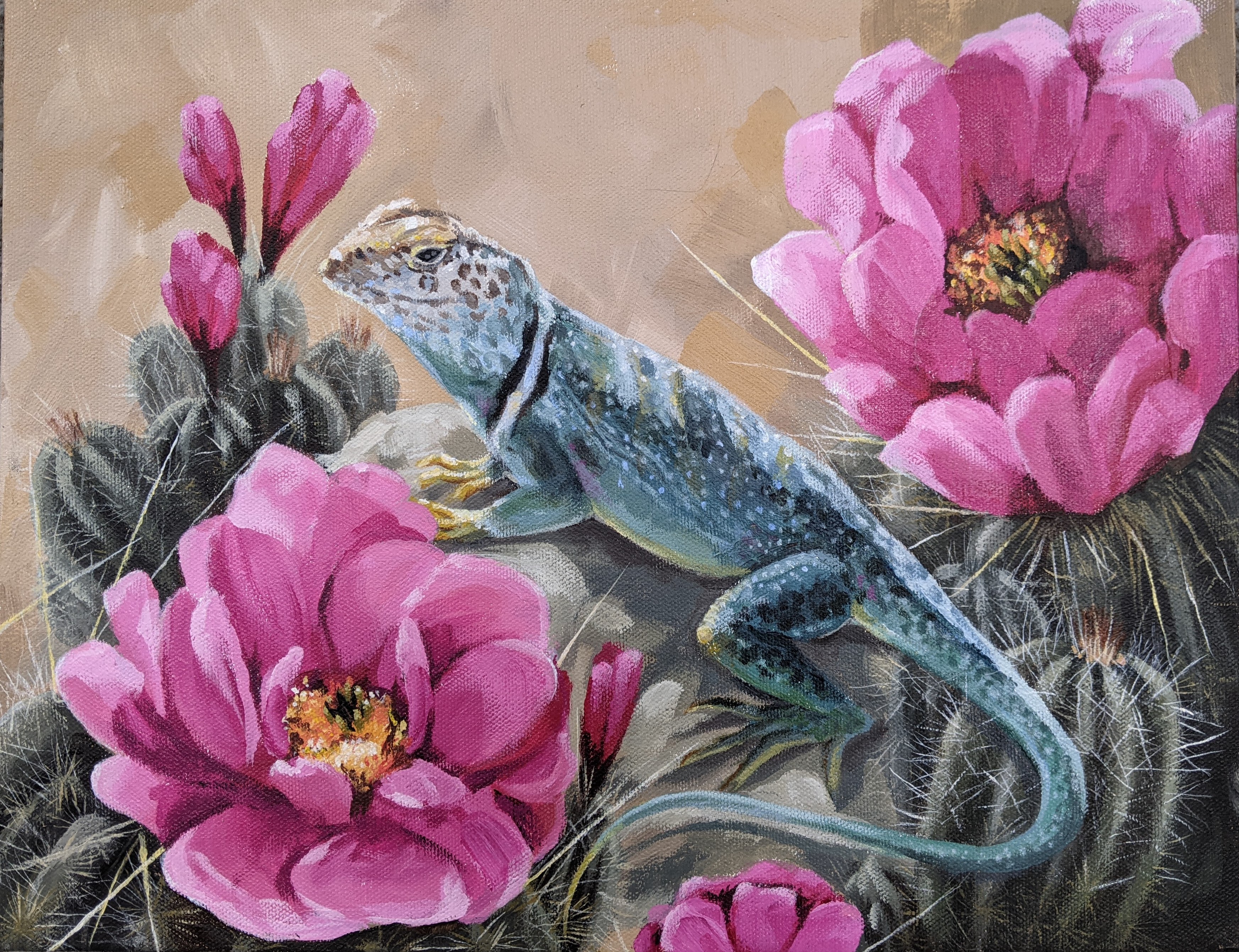 Inspired by a trip to Moab, Utah, I painted this piece to acknowledge the life and color found in the desert, particularly in the Spring. This piece depicts a collared lizard among a blossoming cacti plant.