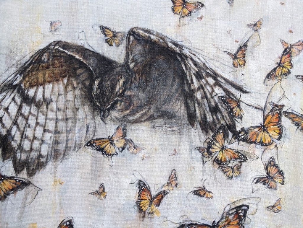 This painting is inspired by folklore and legends from around the world. Butterflies are universally thought to be the spirits of our departed friends and family, come back to offer wisdom and comfort and relay messages. Owls are seen as omens of death, the ferryman of souls to the afterlife, and beings of spiritual and intellectual wisdom.